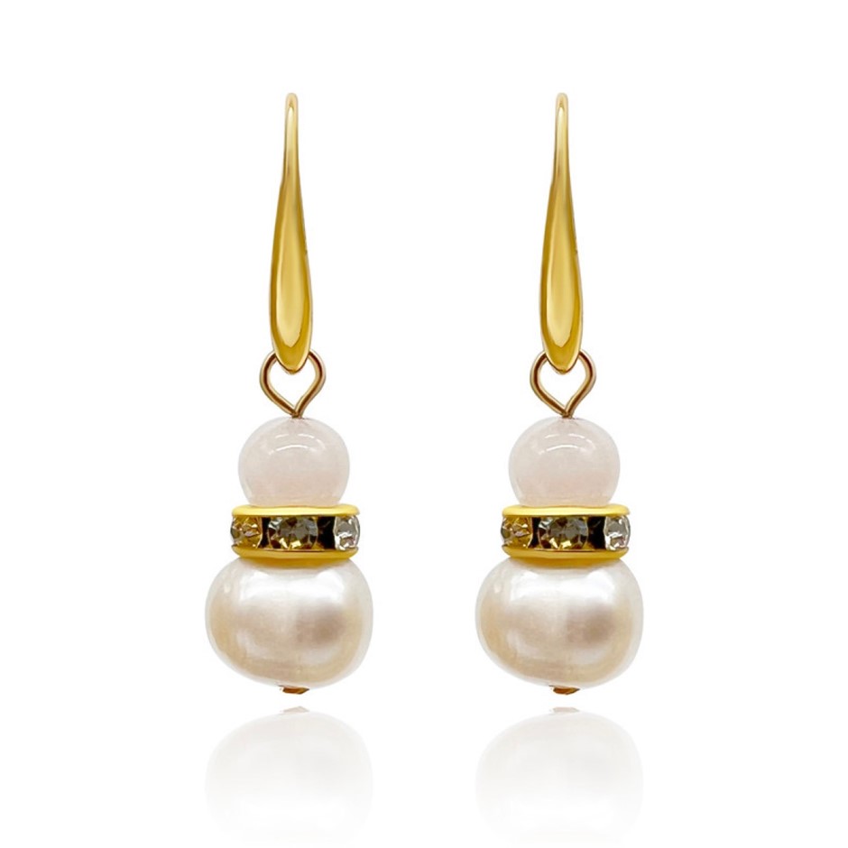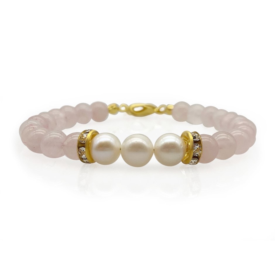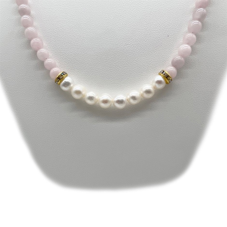 Natural 7-8mm Freshwater Pearl & Rose Quartz with Real 18k Gold Plated Necklace, Bracelet & Earring Set