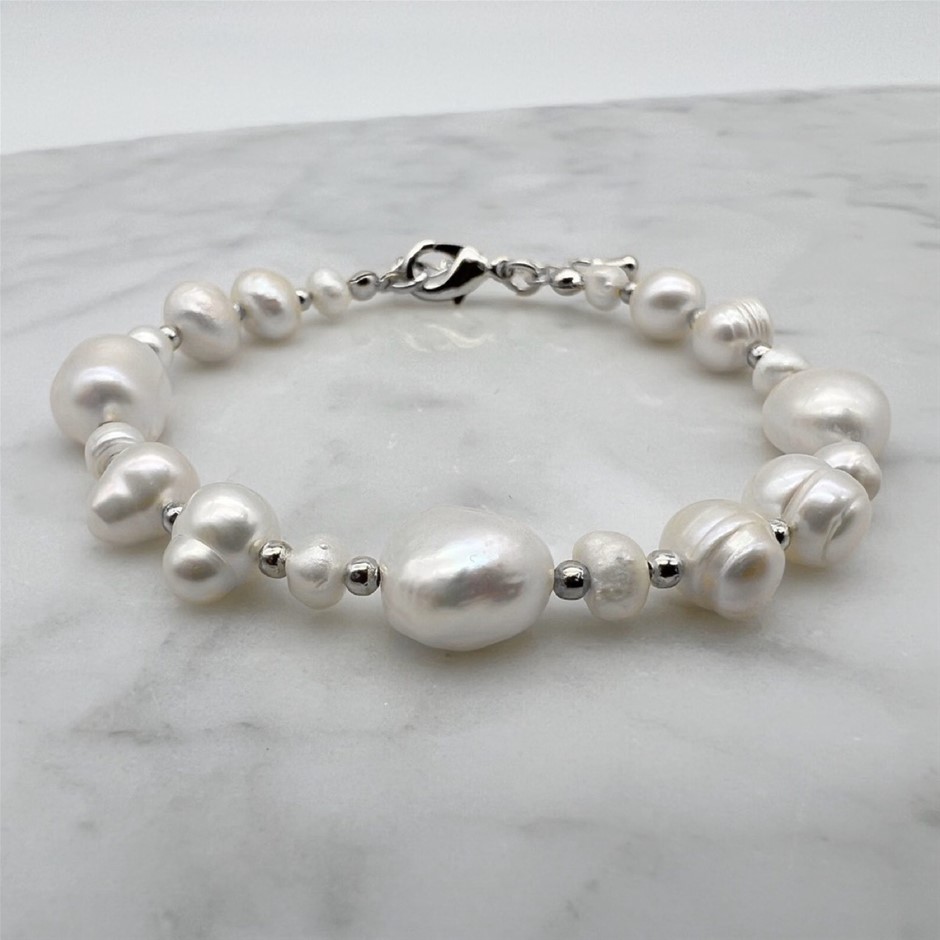 Natural Flat Edge Baroque & Freshwater Pearls Real Platinum Plated Bracelet.