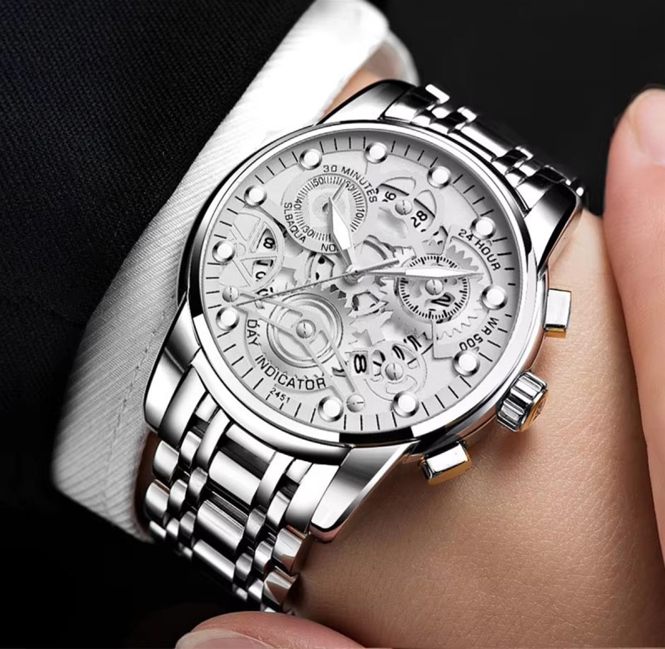 Experience a bold, masculine timepiece engineered for performance, confidence, and durability. This men’s stainless steel watch features decorative triple sub-dials, a scratch-resistant and sweat-proof finish, and a powerful night-light function with strong luminous coating for superior readability at any hour. Its precision calendar movement and IP vacuum plating deliver long-lasting reliability and style. Designed for men who want a watch that works as hard as they do—strong, stylish, and ready for every challenge.