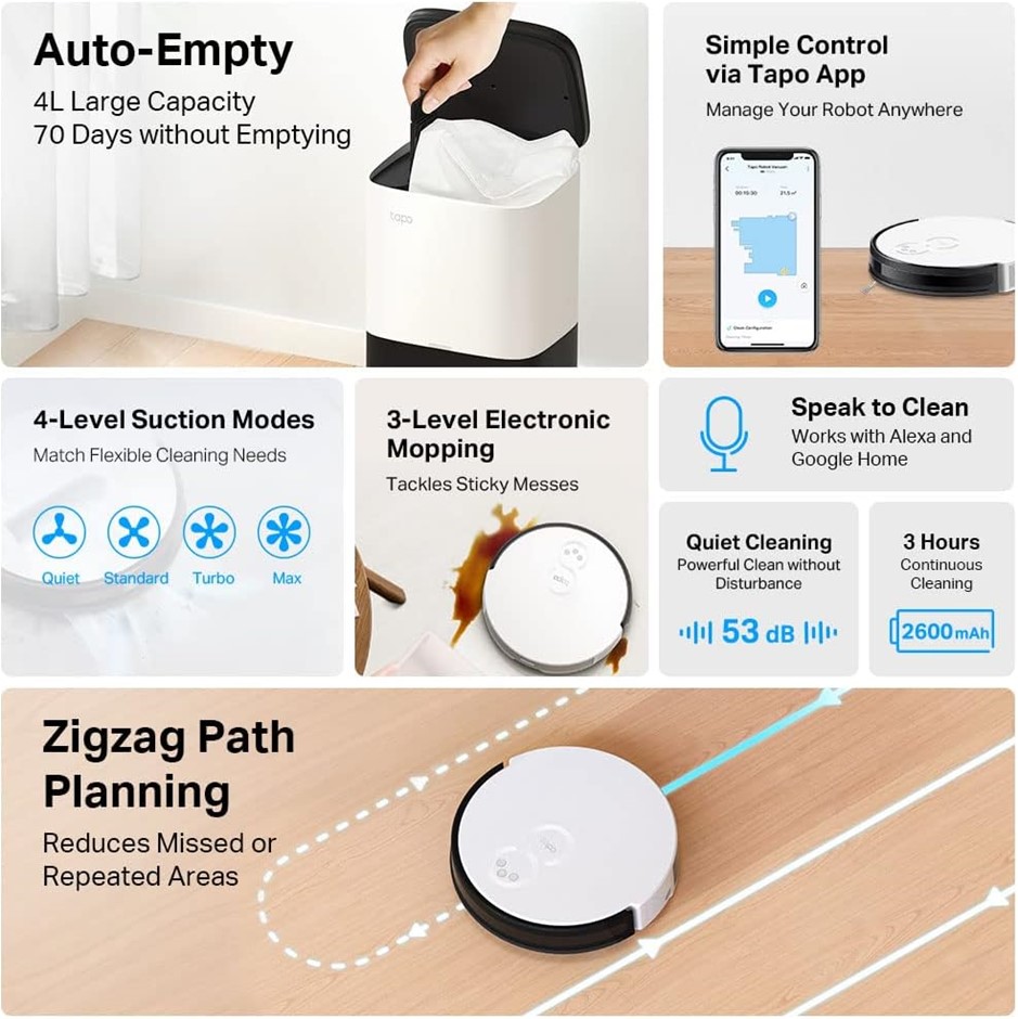 TAPO TP-Link Robot Vacuum & Mop Cleaner, 4L Dust Bag, Smart Auto-Empty Dock