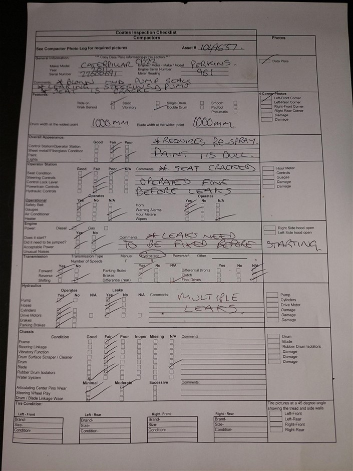 • Damage: Blown hyd pump seal, paint scratches, surface rust, seat has splits, multiple leaks. See inspection checklist report in pics.
