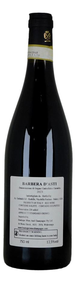 The **Mario Giribaldi Barbera d'Asti DOCG 2023** is a vibrant and expressive red wine from the heart of the Piedmont region in Italy. It offers a nose full of fresh, ripe red berries like cherry, raspberry, and blackberry, alongside subtle floral notes and a touch of spice. On the palate, it’s medium-bodied with bright acidity, which is characteristic of Barbera. The fruit-forward flavors are balanced by a gentle hint of oak, adding depth and a smooth, silky texture. The wine has soft tannins, making it easy-drinking yet flavorful, with a clean, refreshing finish. It pairs wonderfully with classic Italian dishes like pasta with tomato sauce, pizza, or roasted meats.