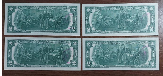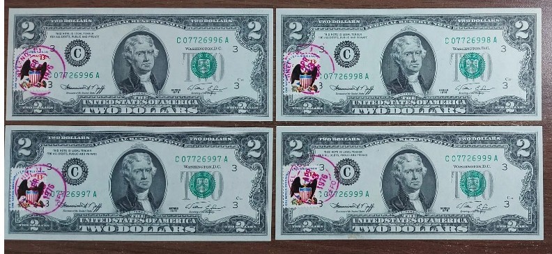 1976 US $2 Bill - UNC Set of 4 consecutive notes with date of issue stamps