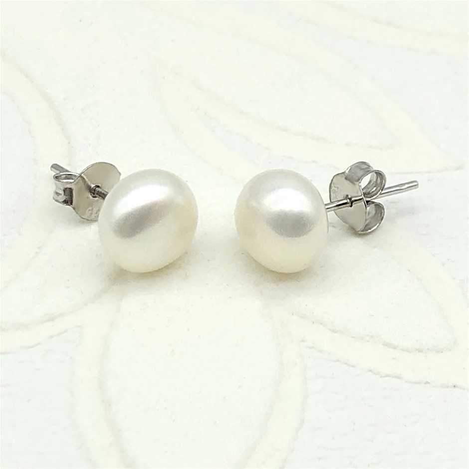 8.5-9mm Button White Freshwater Pearl 925 Sterling Silver Stud Earrings.