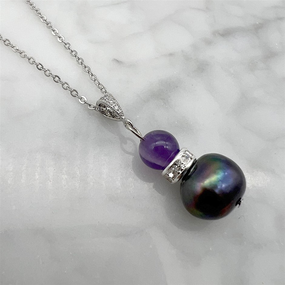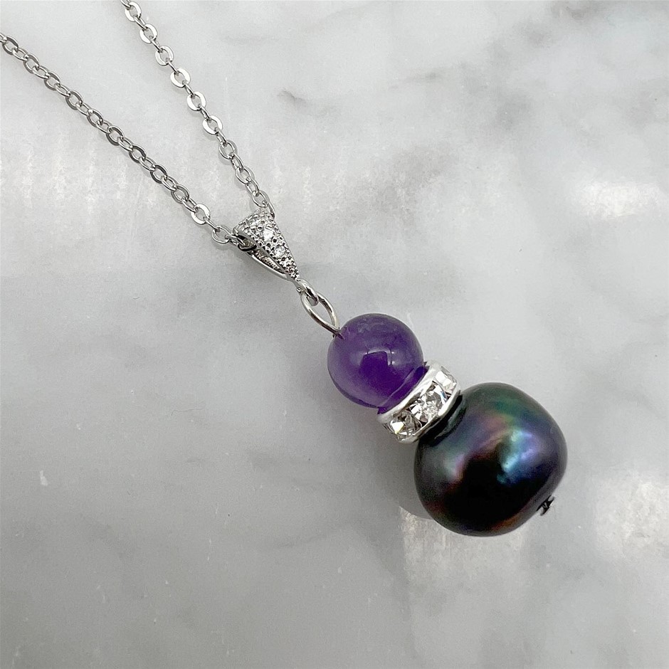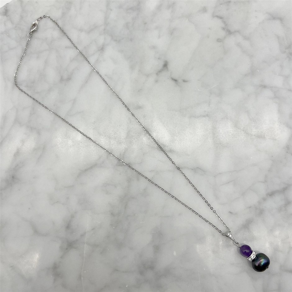 Genuine Pearl & Amethyst Platinum Plated Pendant Necklace