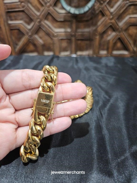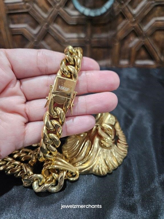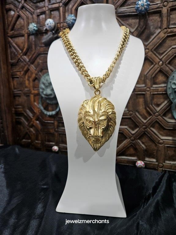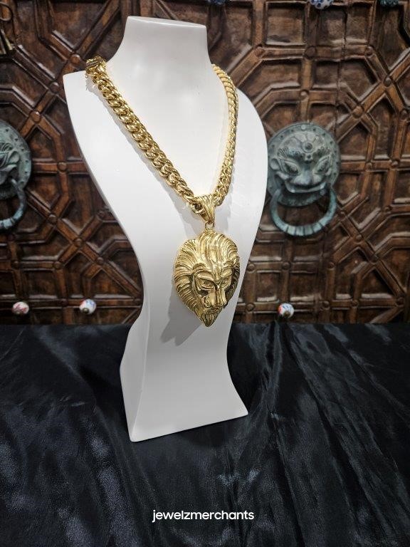 • 18K Triple Yellow Gold Plated Cuban Chain Necklace and one 18k Triple Yellow Gold Plated Lion Head Pendant