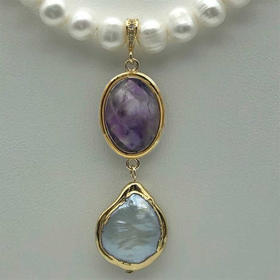 7-8mm Natural Potato & Baroque Freshwater Pearl with Amethyst Real 18k Gold Plated Necklace.