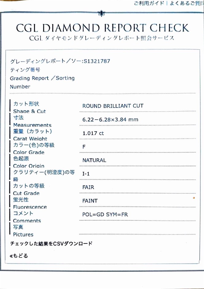 1.017ct One Stone NATURAL Dia. Round F/I1 With CGL Cert.