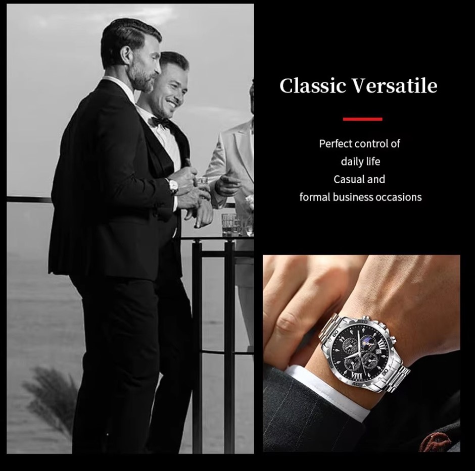 The watch has a multifunctional dial, offering 7 in 1 multifunctional innovative timing, simple and easy to understand sub dial, calendar window, stopwatch dial, 24H timing dial and luminous pointer. It also has the added feature of being water resistant and has a glow in the dark face.