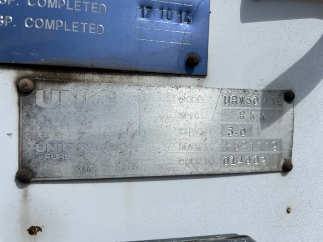 • Crane: Unic Ucan 3.0 model, 10 year inspection (as per plate) 7/10/2014, Serial No: F521119, 3t capacity