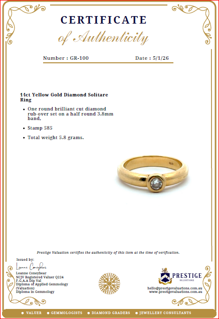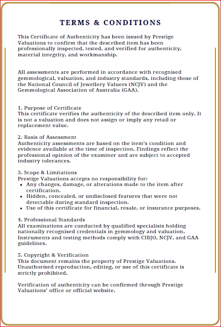 The Certificate of Authenticity means that the actual item for sale has been assessed by a fully qualified specialist jewellery valuer. The specialist jewellery valuer requires knowledge of gemmology, jewellery manufacture, precious metal markets, world gem markets, supply and demand factors both overseas and within Australia, taxation law requirements, general retail practices and the final combination of all the above factors in the principle and procedures of a jewellery valuation. They inspect and assess the jewellery item using a hand lens taking note of several key factors-