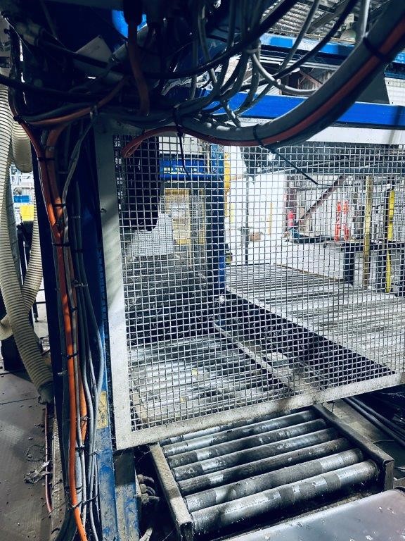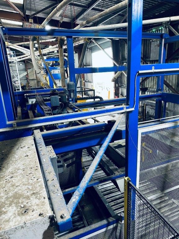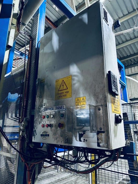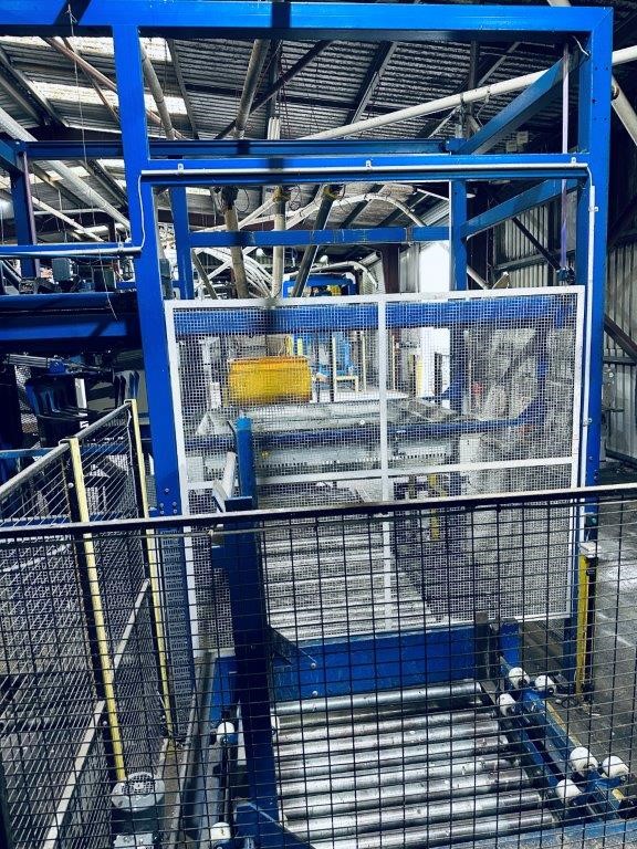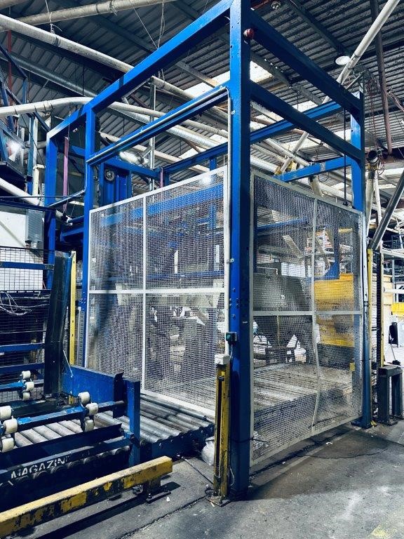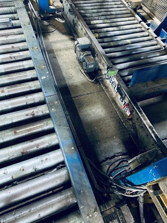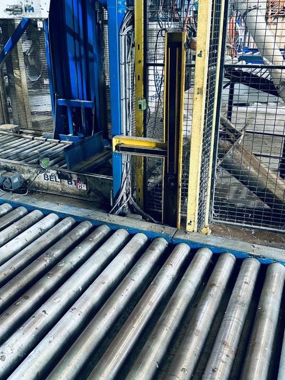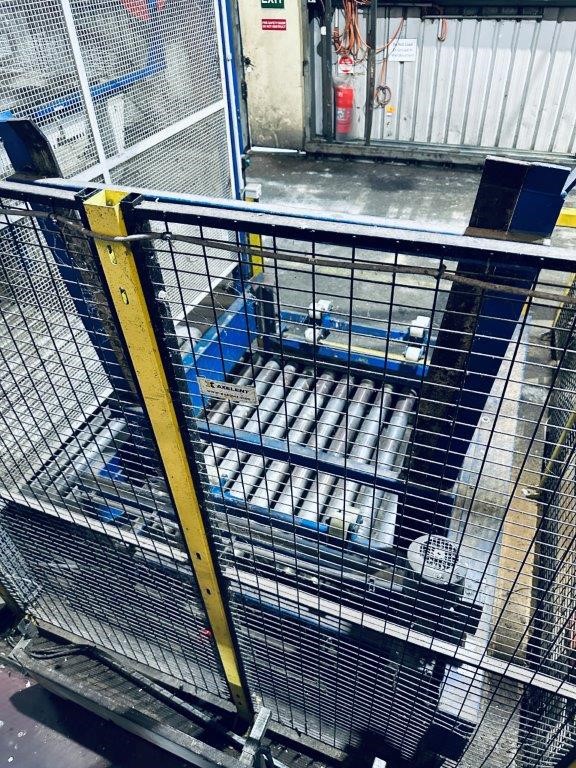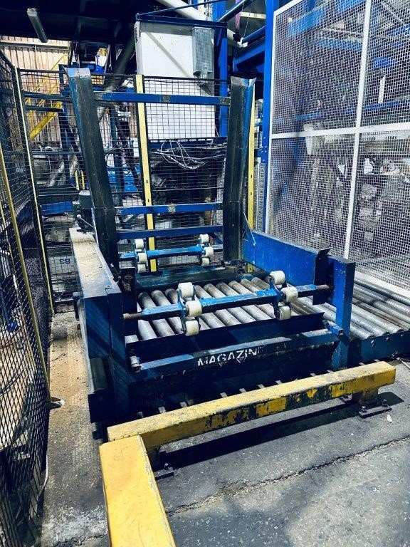 • Comprising roller conveyor sections, pallet magazine unit, transfer/push mechanism and integrated control panel, mounted within structural steel frame, complete with mesh safety guarding and interlocked access gates. Control system housed in wall-mounted electrical enclosure. Fitted with driven roller conveyor sections and pallet transfer assembly for pallet positioning and discharge.
