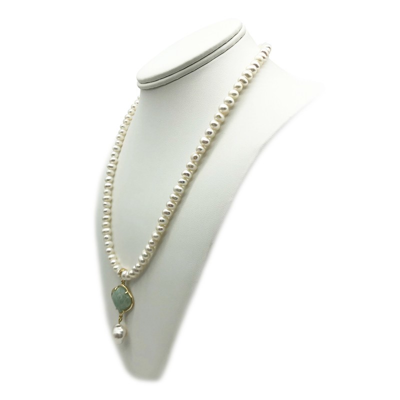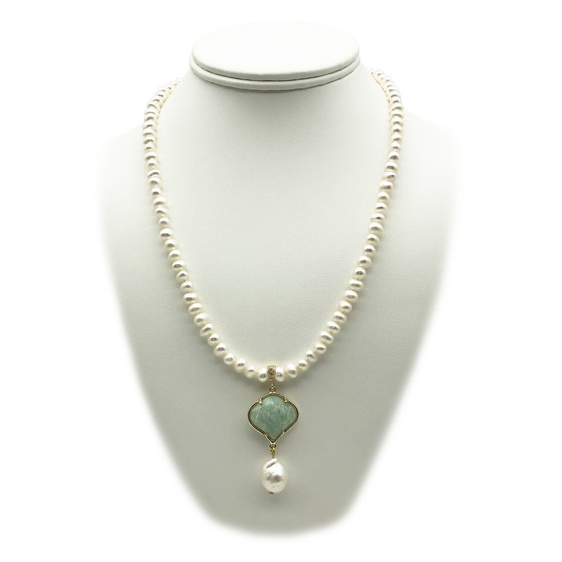 6-7mm White Freshwater & Baroque Pearl with Amazonite Pendant Charm Necklace.