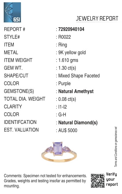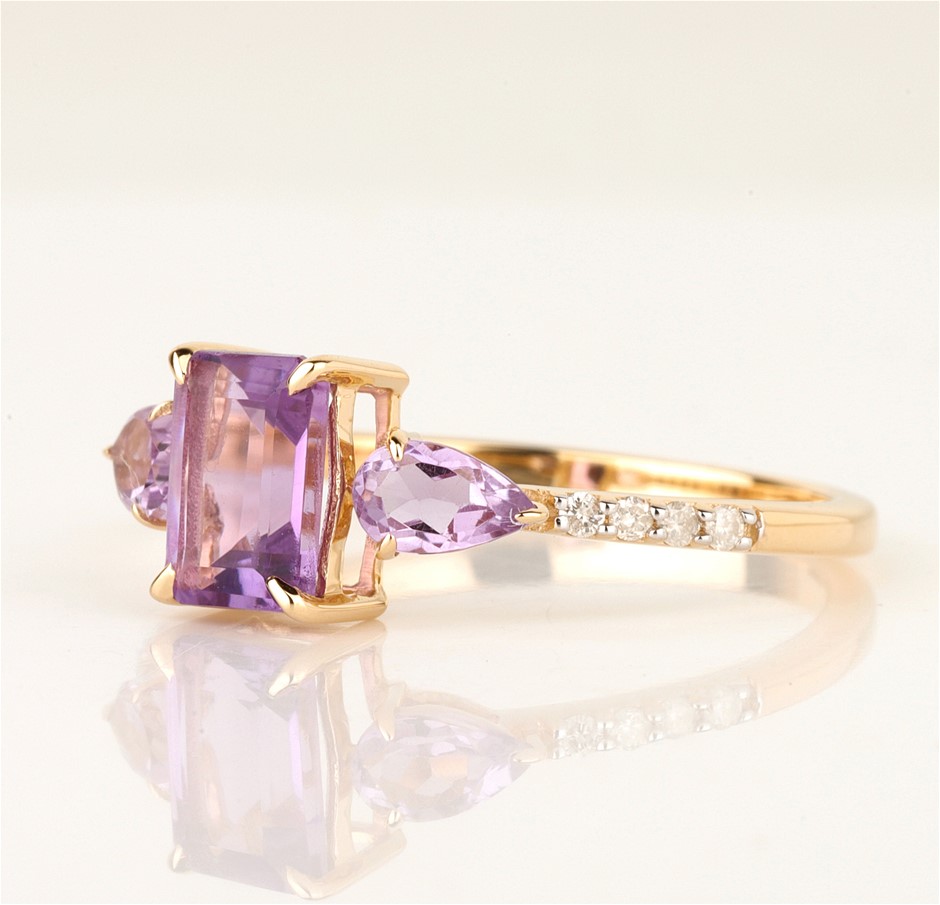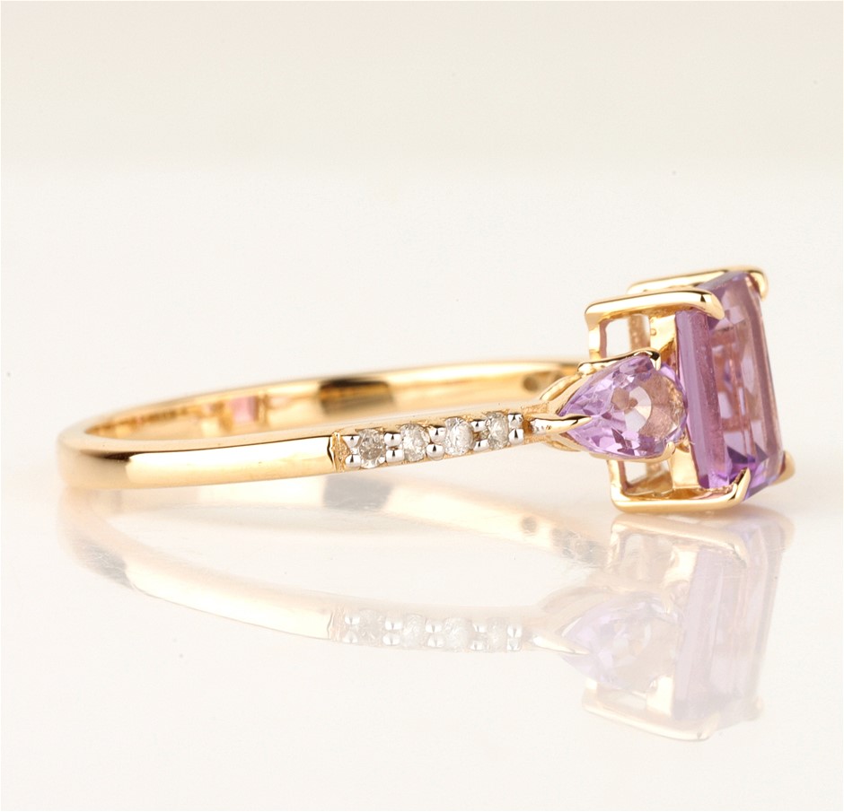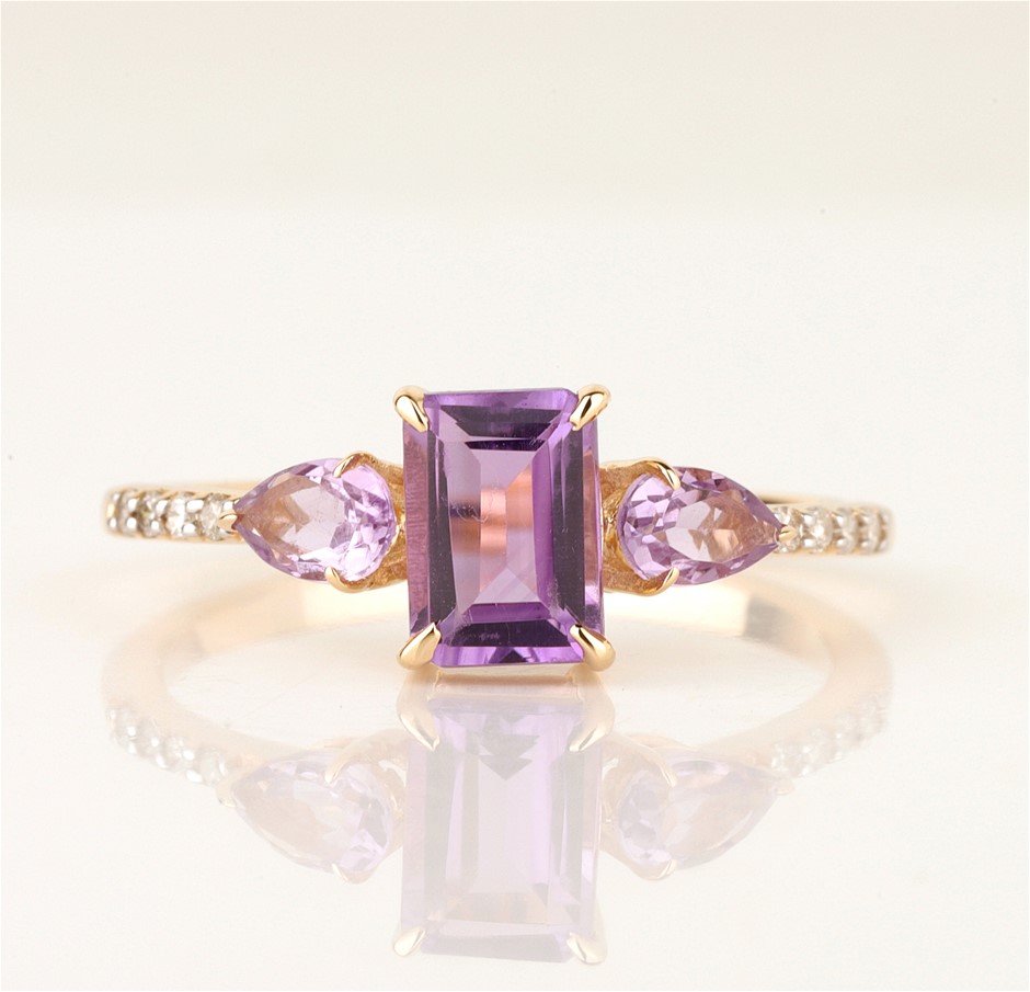 9ct Yellow Gold Natural Amethyst & Diamond Ring with Valuation