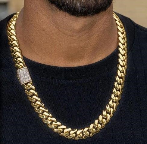 • Italian 14k yellow Gold Filled cuban chain with simulated diamonds stones for Women and Men with 14k stamped .The base metal is copper