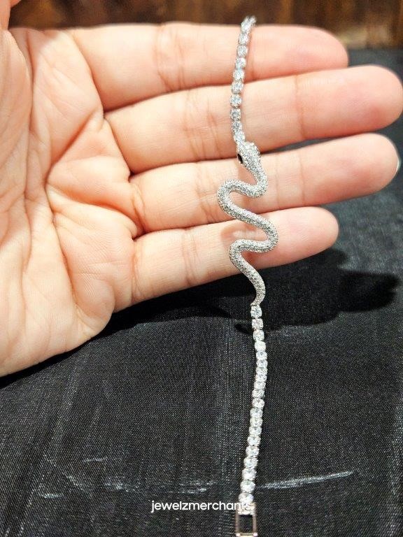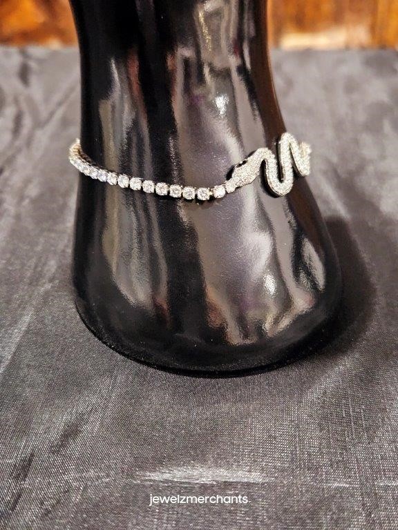 Big Clearance Sale at Jewelz Merchants! Italian 18k White Gold Filled tennis head snake Bracelet with White Simulated Diamonds and Two Black stone eyes head snake for Women and Men with 18k Stamped(18cm).