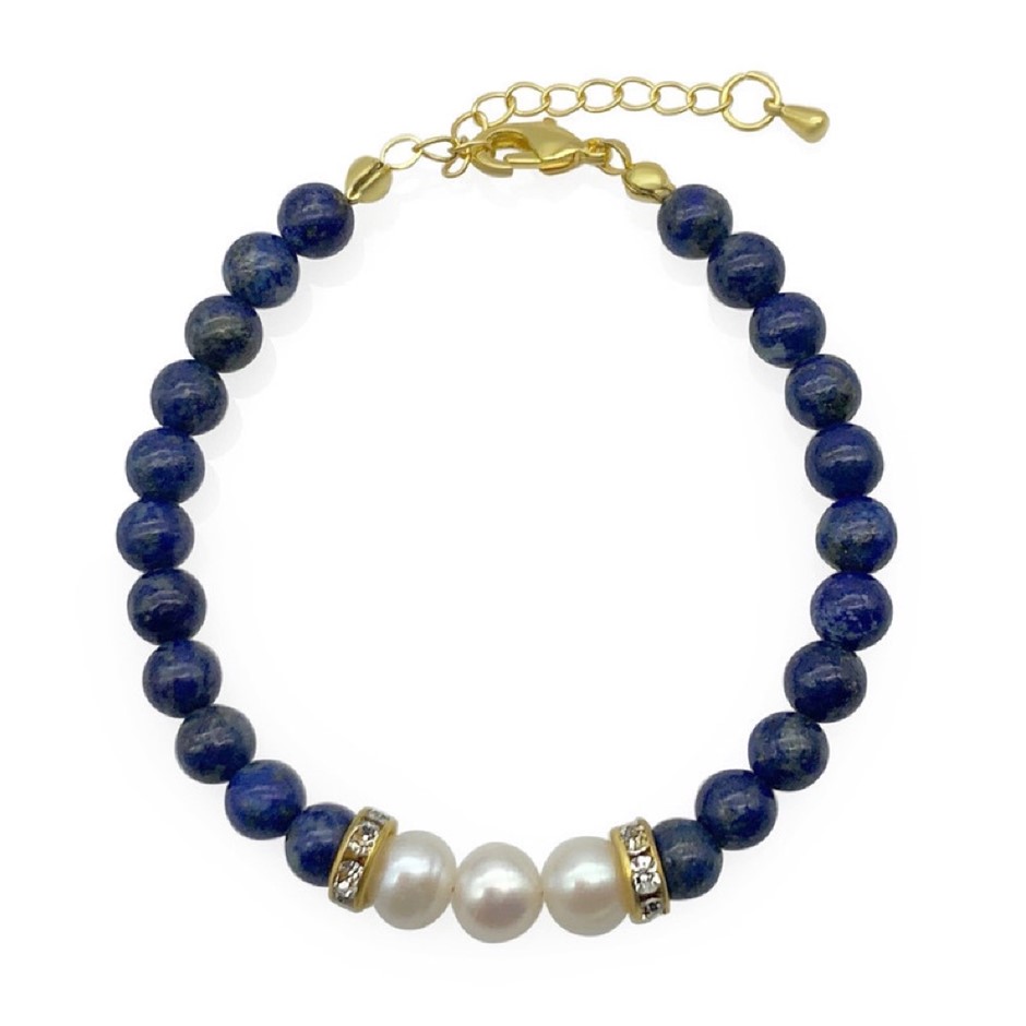 Natural 7-8mm Freshwater Pearl & Lapis Lazuli with Real 18k Gold Plated Necklace, Bracelet & Earring Set