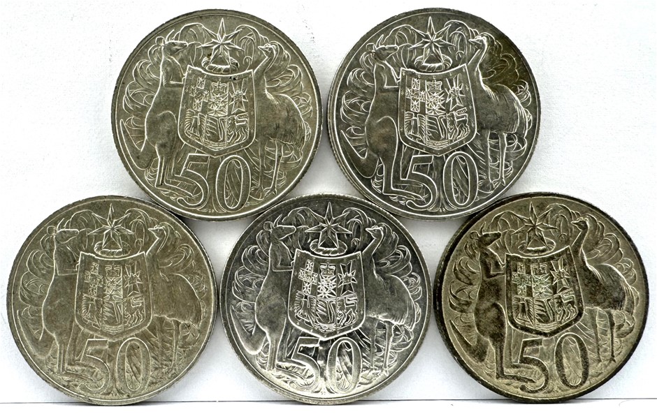 FIVE 1966 ROUND AUSTRALIAN 50C COINS (80% SILVER)