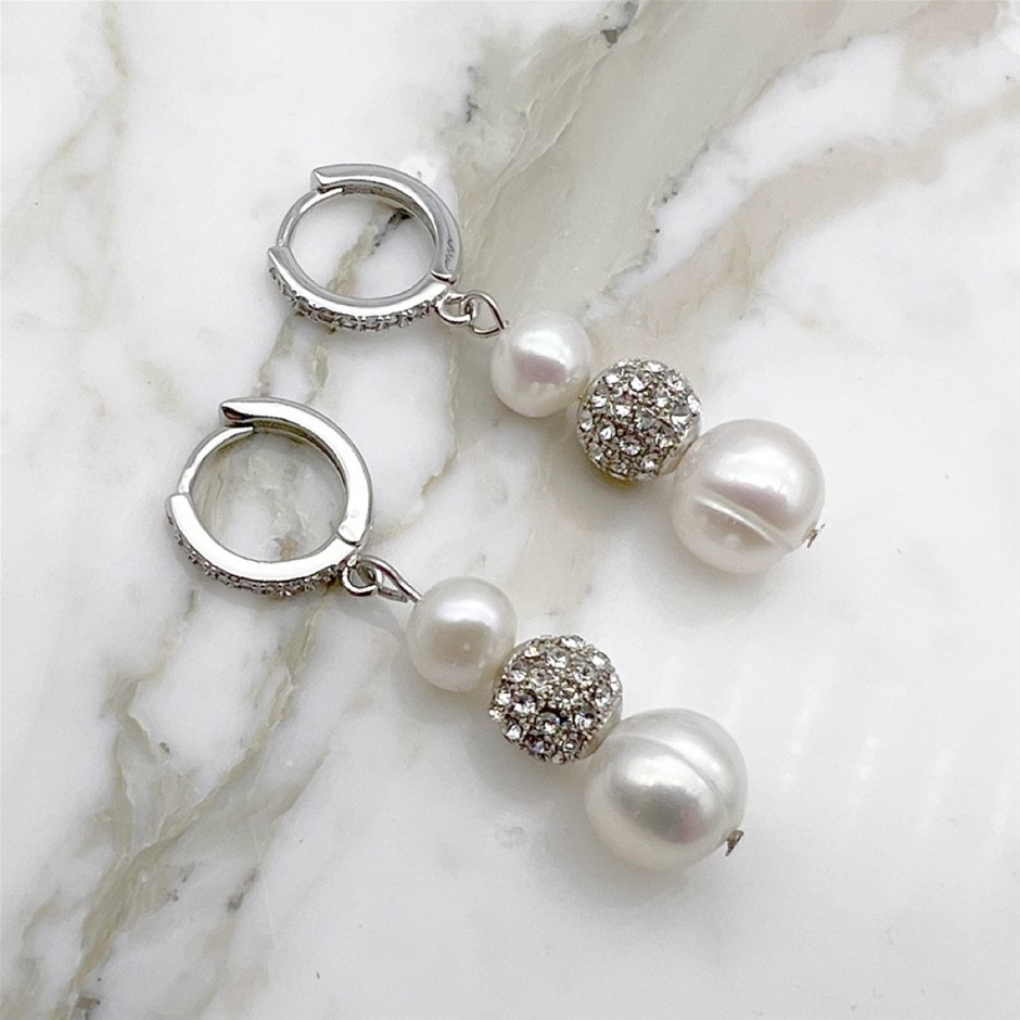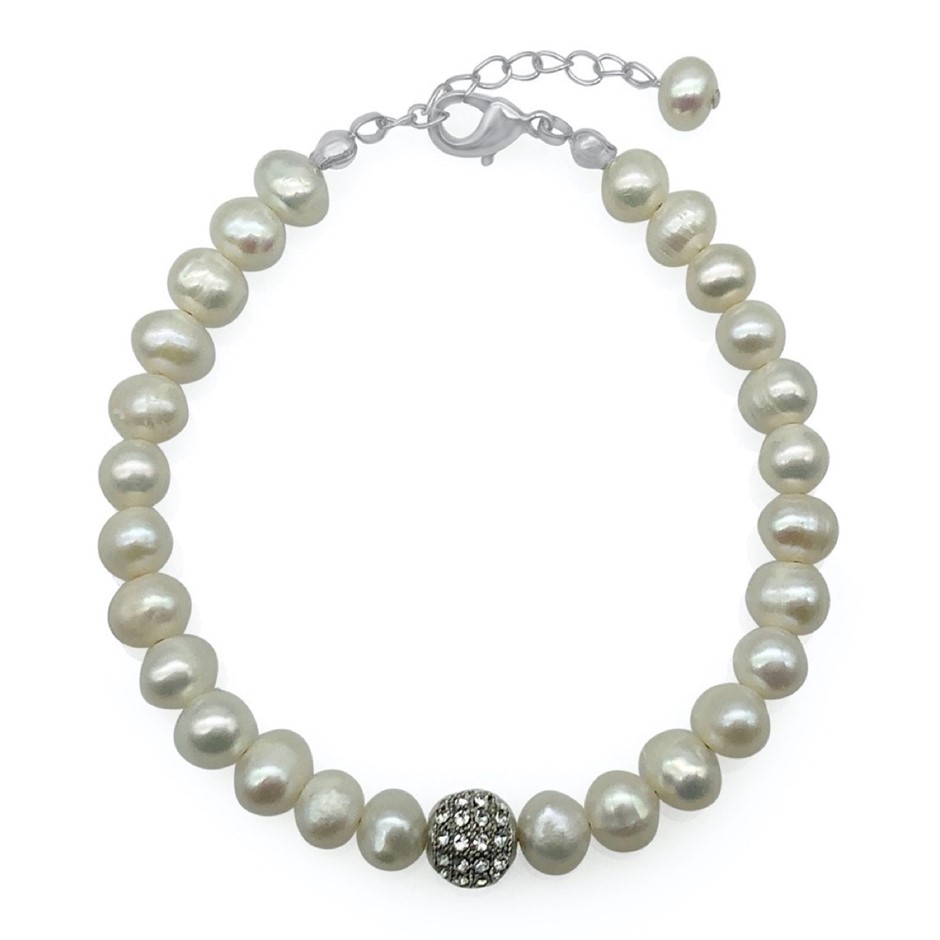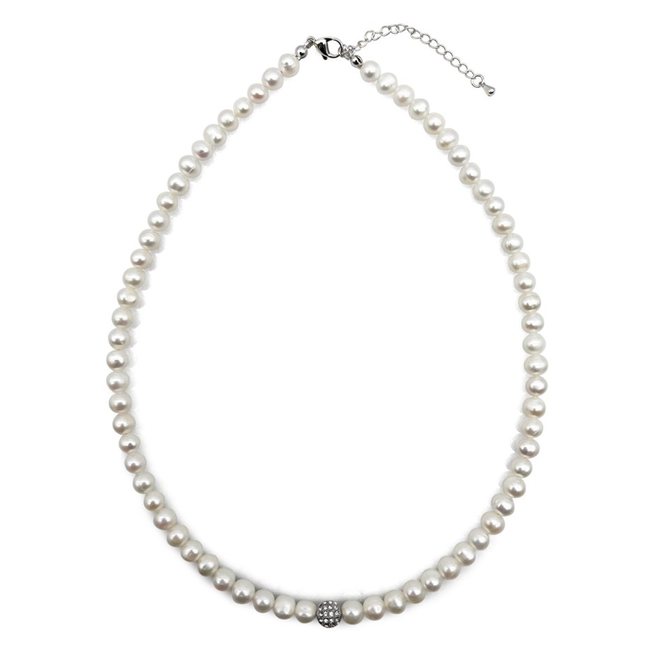 7-8mm Natural White Freshwater Pearl & Rhinestone Real Platinum Plated Necklace, Bracelet & Earring Set