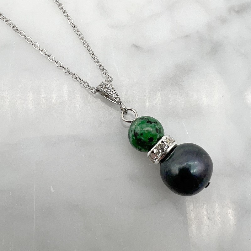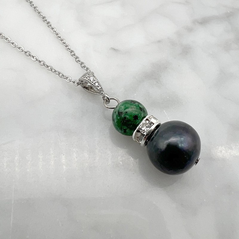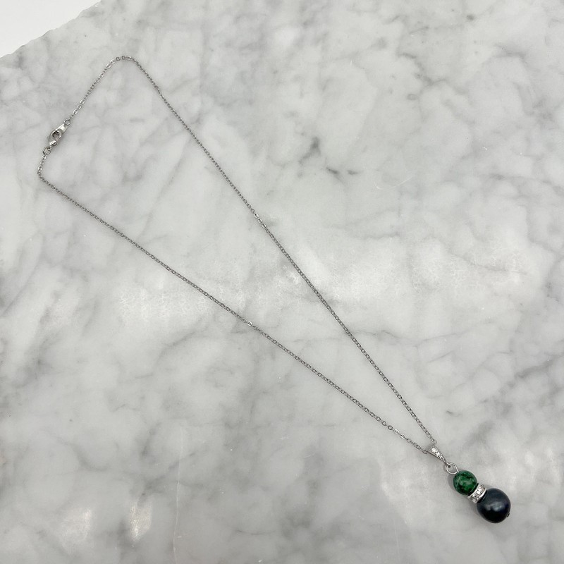 GenuinePearl & Dark African Jasper `Turquoise` Platinum Plated Pendant Necklace
