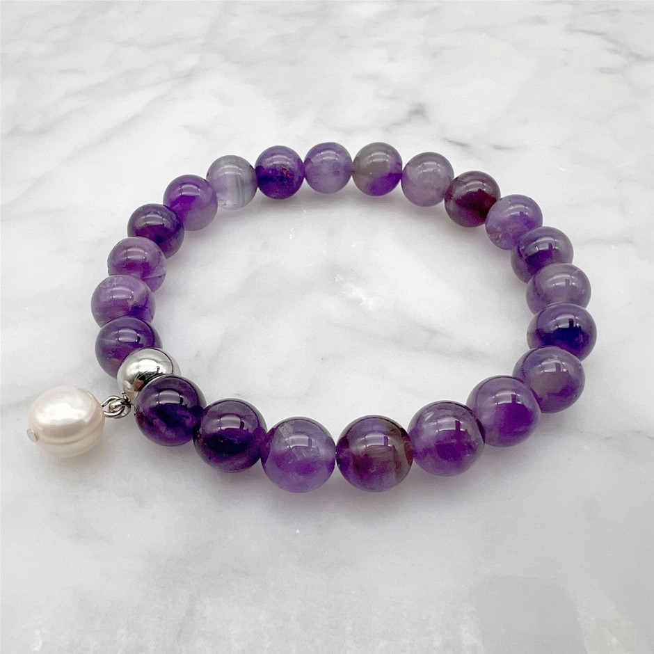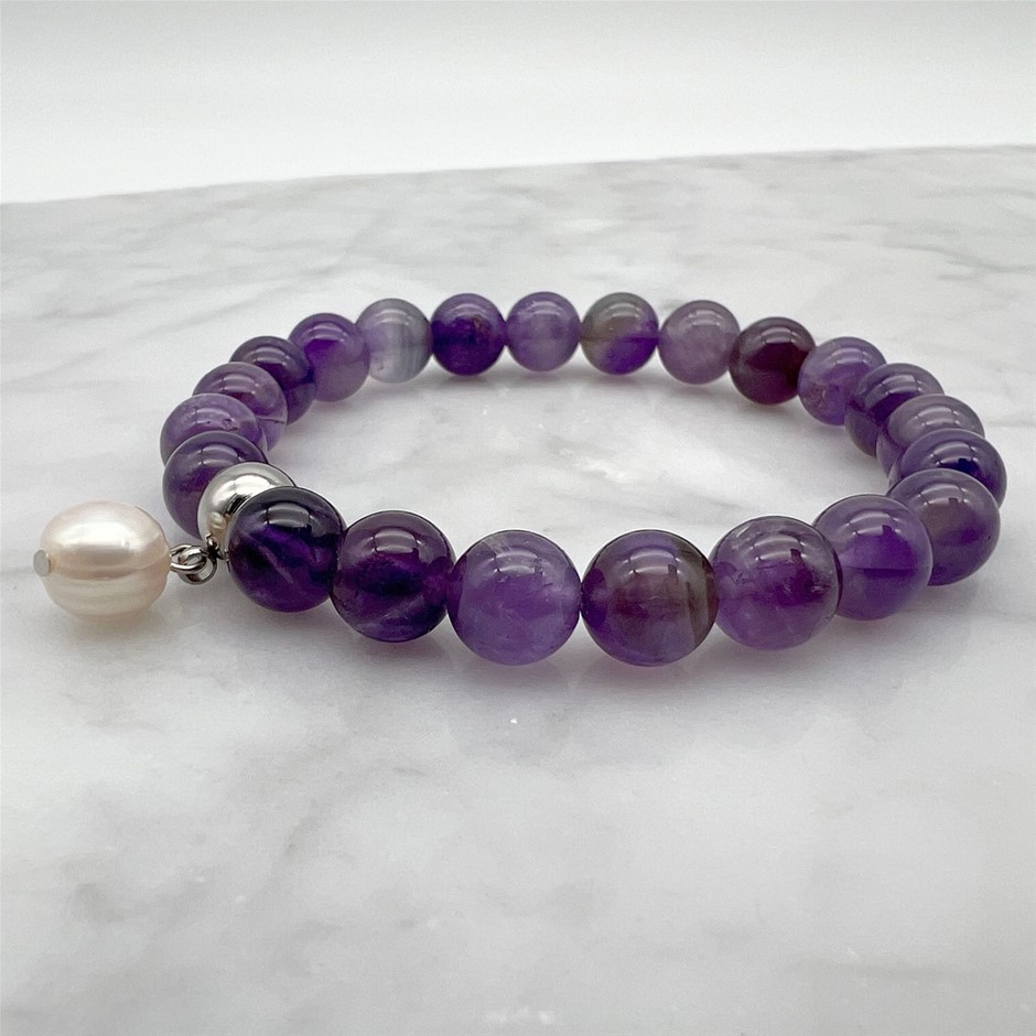 Large Freshwater Pearl and Amethyst Gemstone Beaded Bracelet.