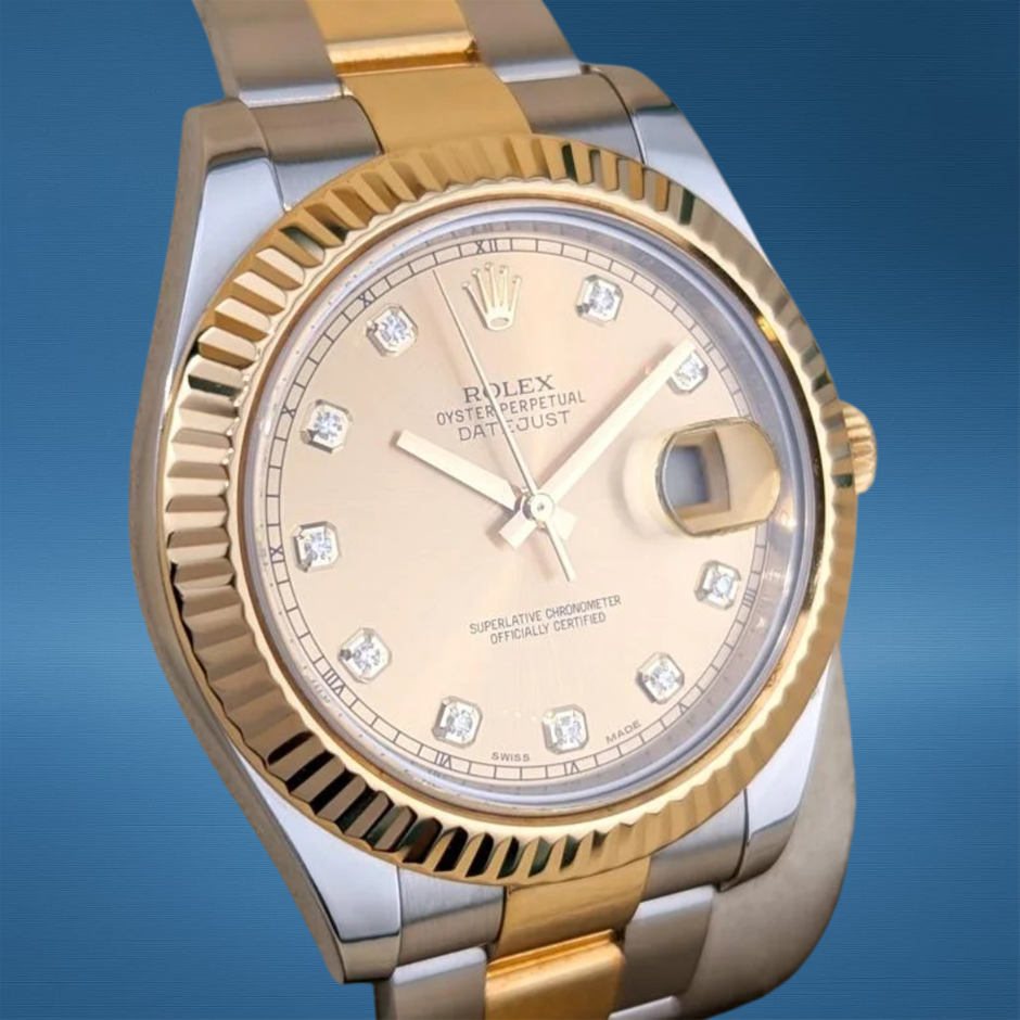 The Rolex Datejust II 116333 with its elegant champagne diamond dial and classic two-tone construction balances timeless luxury with modern wrist presence, making it a standout choice for both everyday wear and special occasions. Its reliable automatic movement and iconic Rolex details ensure enduring performance and style.