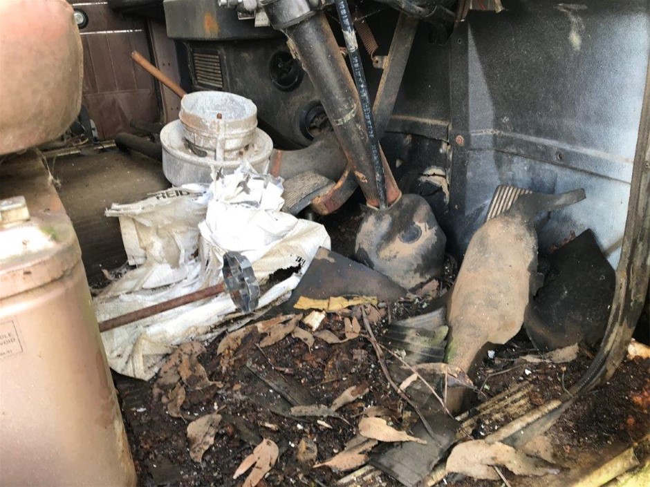 • Damage: Dents & corrosion evident. Windscreen smashed. ID plate not visible, covered in moss