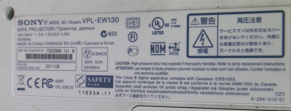 • 1x Sony Model- VPL-EW130 WXGA Data Projector, 1x HDMI Port, Mfg. Date- 08-2011 ( S/n- 7002569131S )