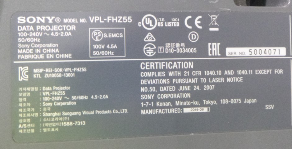 • 1x Sony Model- VPL-FHZ55 WUXGA Data Projector With Partial Mount Bracket Only, 1x HDMI Port, Mfg. Date- 06-2014 ( S/n- 5004071 )