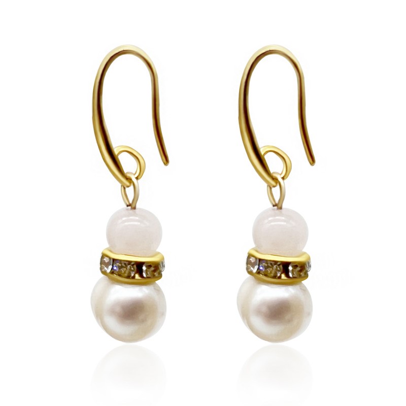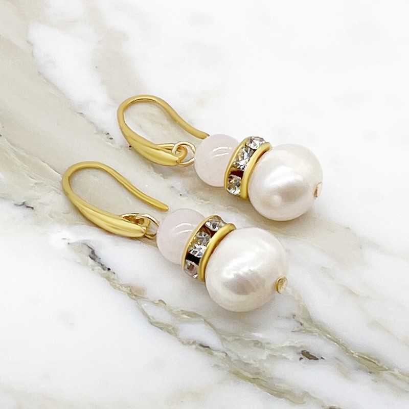 Rose Quartz & Freshwater Pearl Rhinestones Gold Plated Drop Earrings.