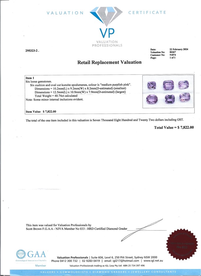 The Certificate of Authenticity means that the actual item for sale has been assessed by a fully qualified specialist jewellery valuer. The specialist jewellery valuer requires knowledge of gemmology, jewellery manufacture, precious metal markets, world gem markets, supply and demand factors both overseas and within Australia, taxation law requirements, general retail practices and the final combination of all the above factors in the principle and procedures of a jewellery valuation. They inspect and assess the jewellery item using a hand lens taking note of several key factors-