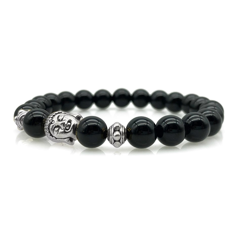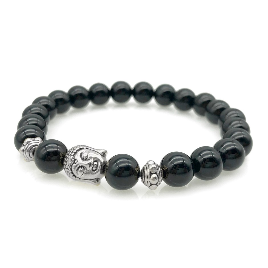 8mm Black Agate & Antique Silver Buddha Chakra Healing Charm Beaded Stretch Bracelet.