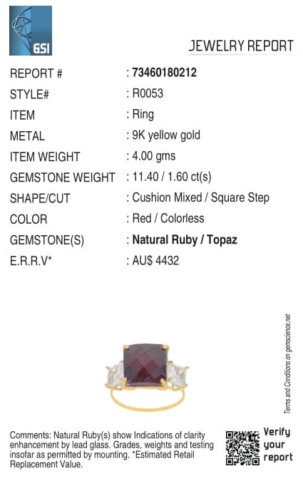 • The Ring consists of (1) Square Brilliant Natural Ruby & (2) Square Brilliant Cut White Topaz.