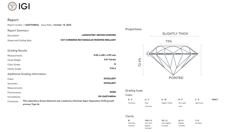 3.01 Carats G/VVS2 Lab Grown Diamond - IGI Certified