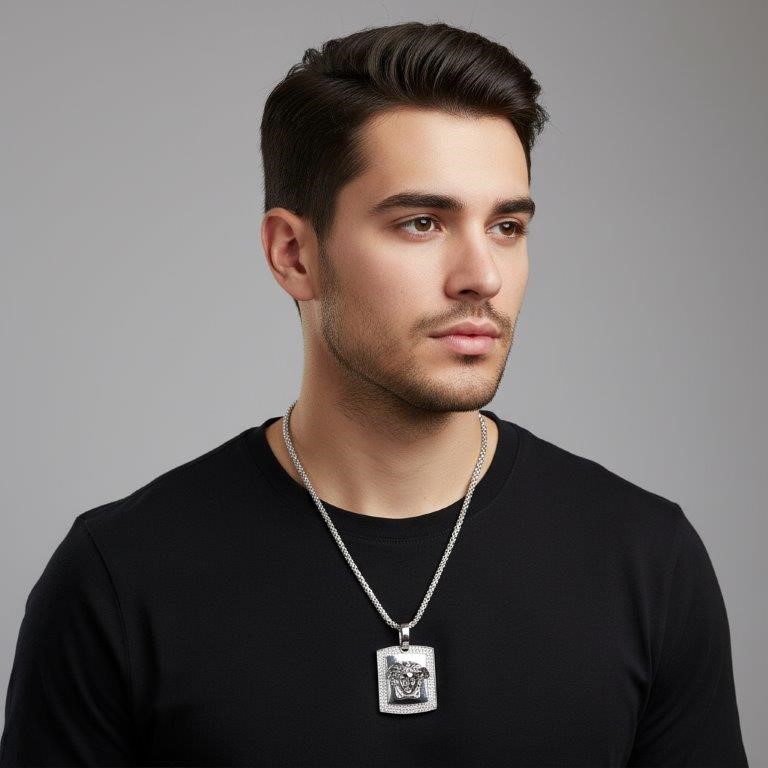 • Make a bold statement with this luxurious 925 Silver/Italy Necklace with free chain , featuring an iconic design adorned with brilliant-cut simulated diamonds for stunning shine. Crafted in Italy and stamped S925, this piece is made of high-quality 925 silver with a gold overlay, combining durability with exquisite style.