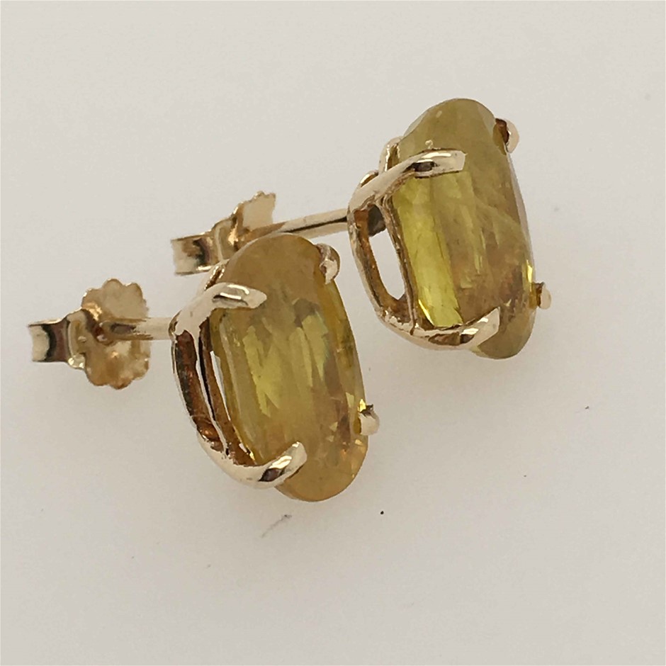 • Two claw set oval shaped yellow sapphires, colour is ``medium``.