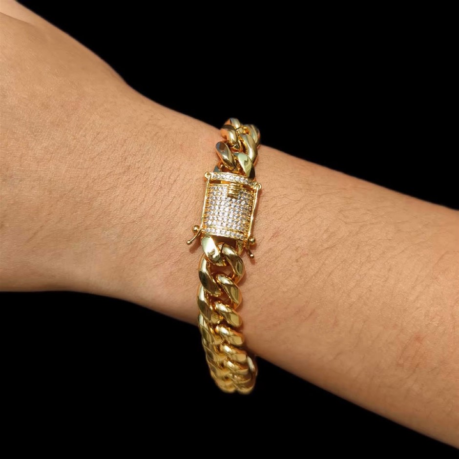 Opulent Galleria - 18K Gold-Filled Cuban Chain Bracelet with Simulated Diamond Clasp, 12MM Wide – 19cm