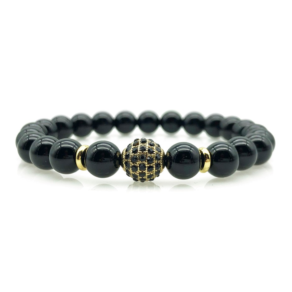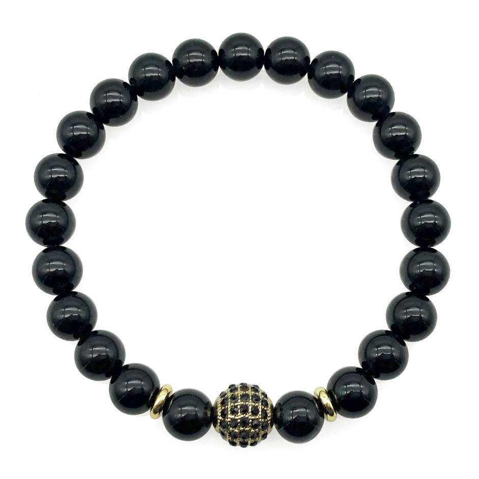8mm Black Agate & Golden Rhinestone Beaded Gemstone Bracelet.