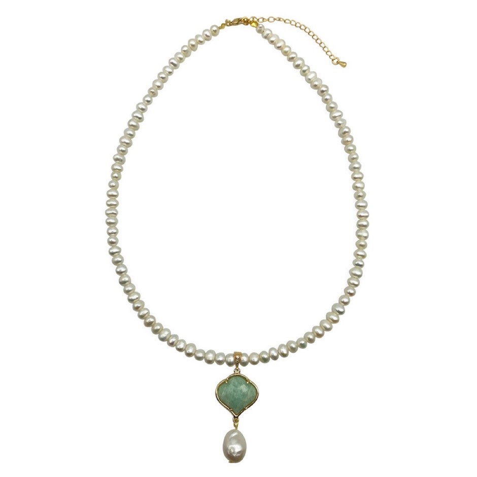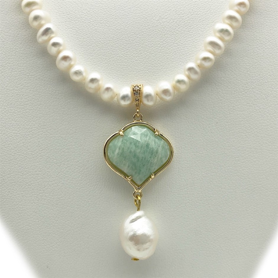 6-7mm White Freshwater & Baroque Pearl with Amazonite Pendant Charm Necklace, Bracelet & Earrings Set Earring Set