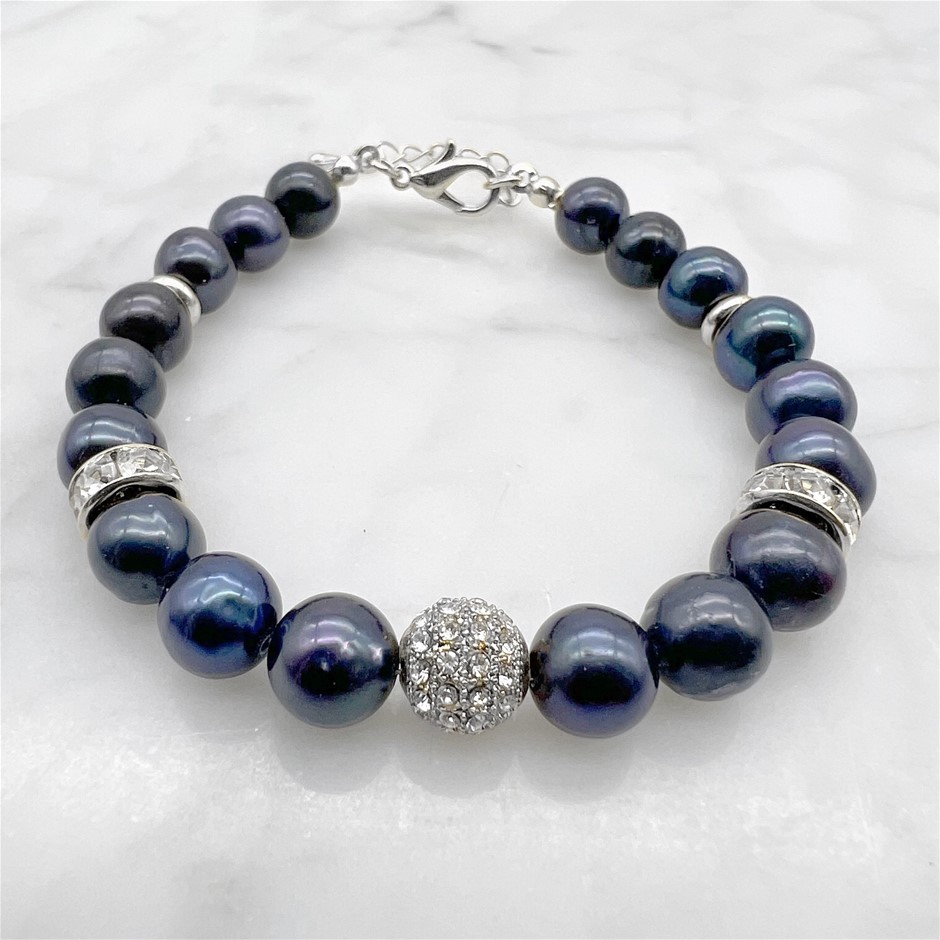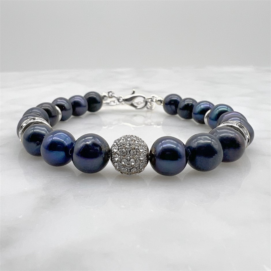 7-8mm Black Freshwater Pearl with Rhinestones & CZ Rhodium Plated Bracelet.