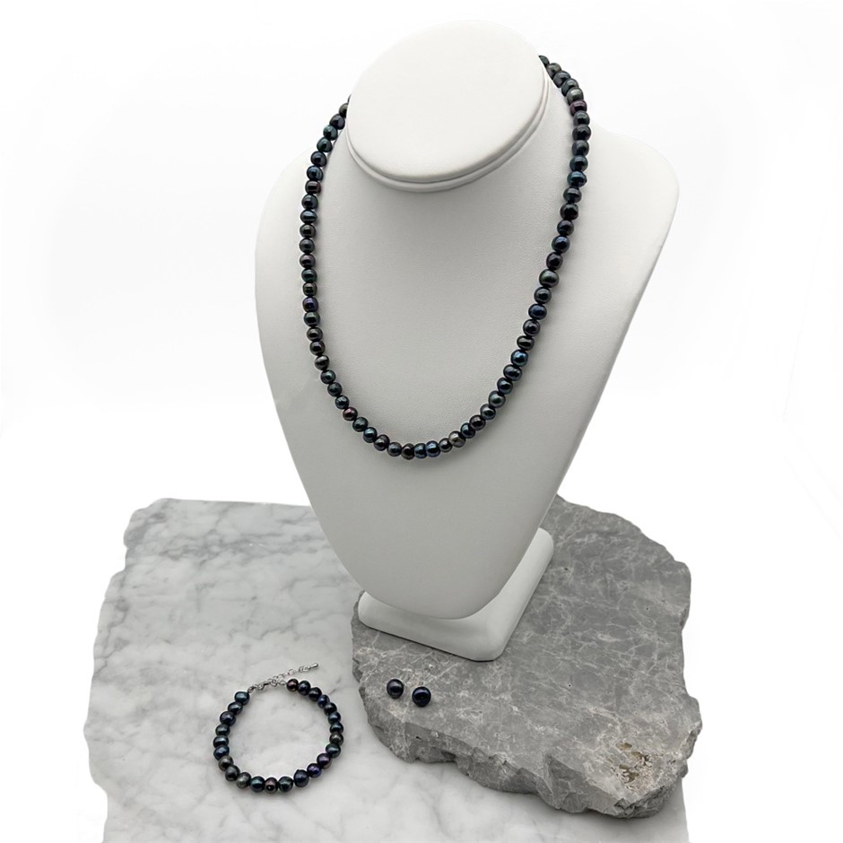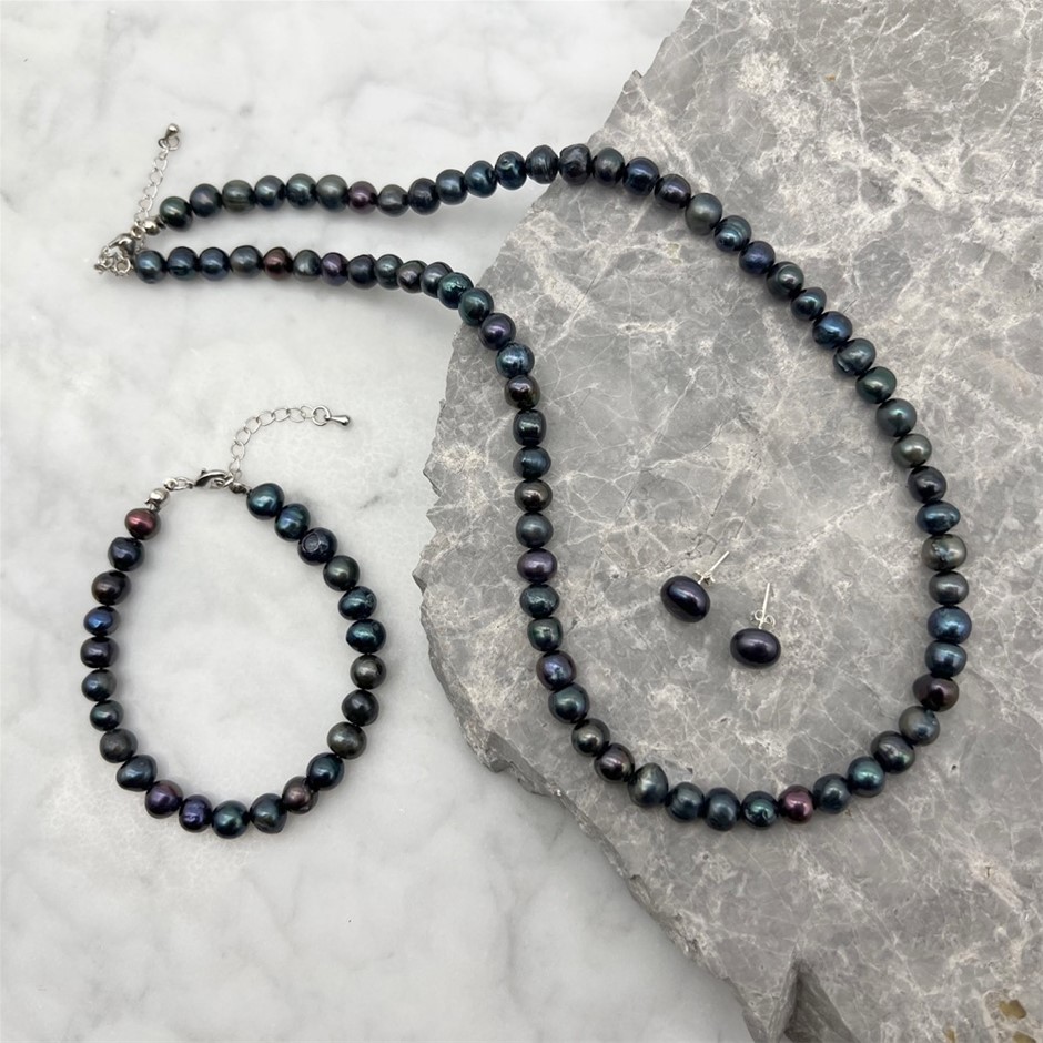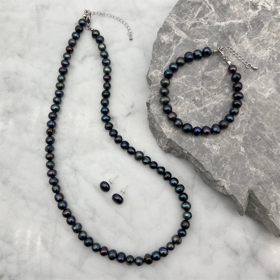 Grade AB 7-8mm Black Pearls Real Platinum Plated Jewellery Set