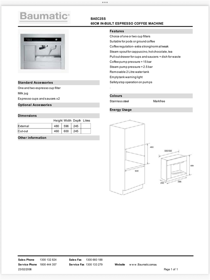 Unused Baumatic Built in Coffee Machine