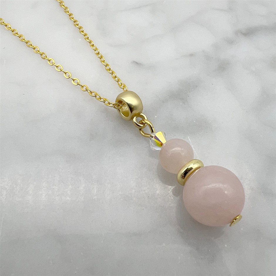 Genuine Rose Quartz & Swarovski® Austrian Crystal Gold Plated Pendant Necklace