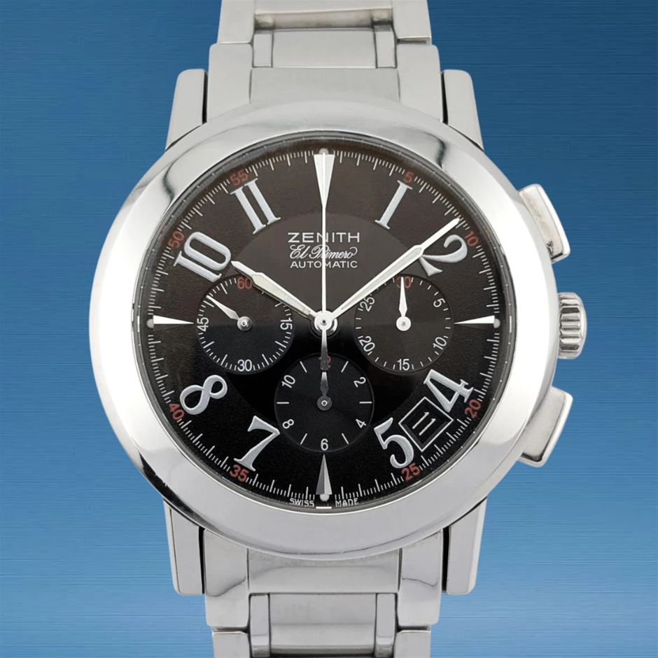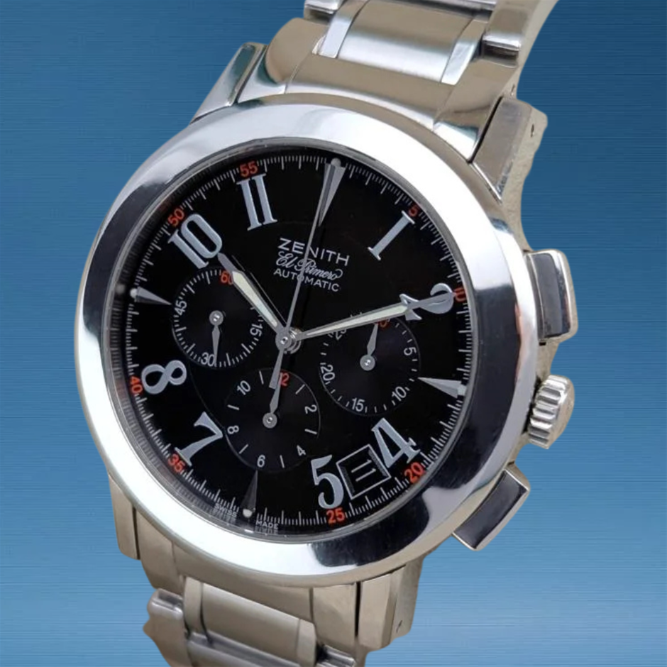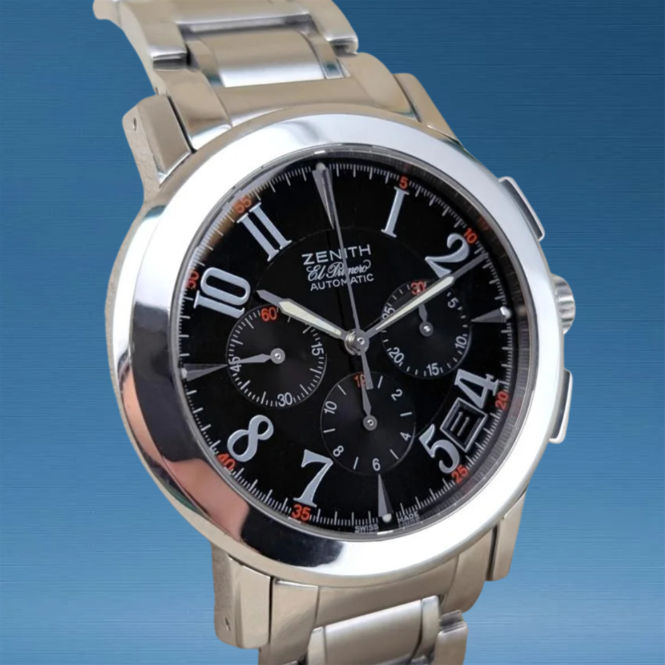 The Zenith El Primero Port Royal stands out with its iconic high-frequency chronograph movement, delivering exceptional timing precision and smooth sweep seconds. Its sporty yet refined 40 mm profile and clean black dial make it equally suited to everyday wear and performance-minded chronograph use.