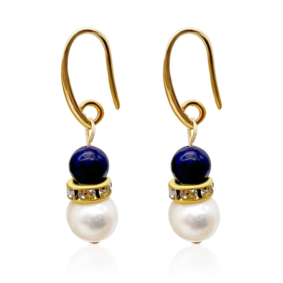Lapis Lazuli & Freshwater Pearl Rhinestones Gold Plated Drop Earrings.