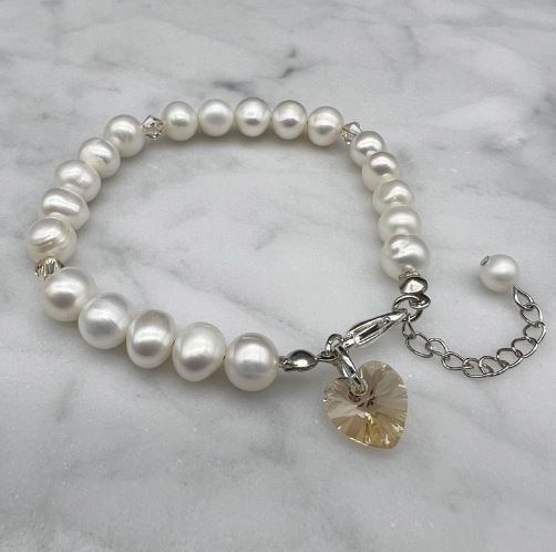 7-8mm Natural Potato & Baroque Freshwater Pearl with Swarovski® Heart Charm Bracelet.