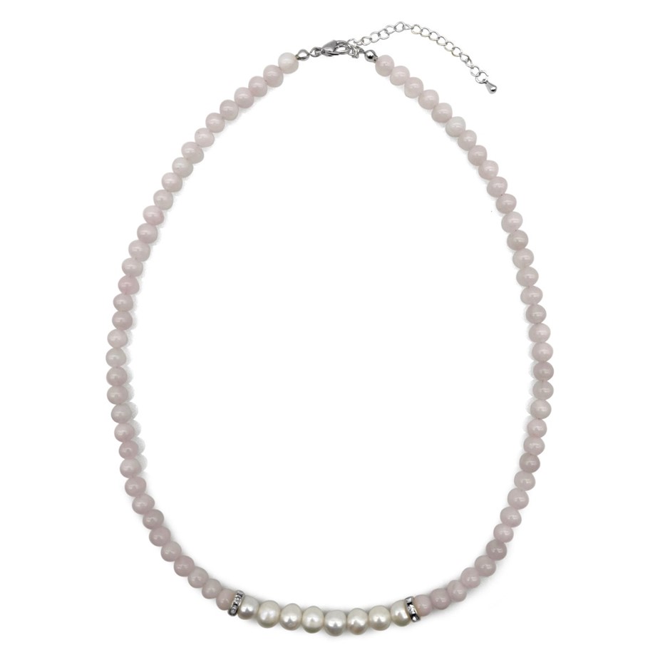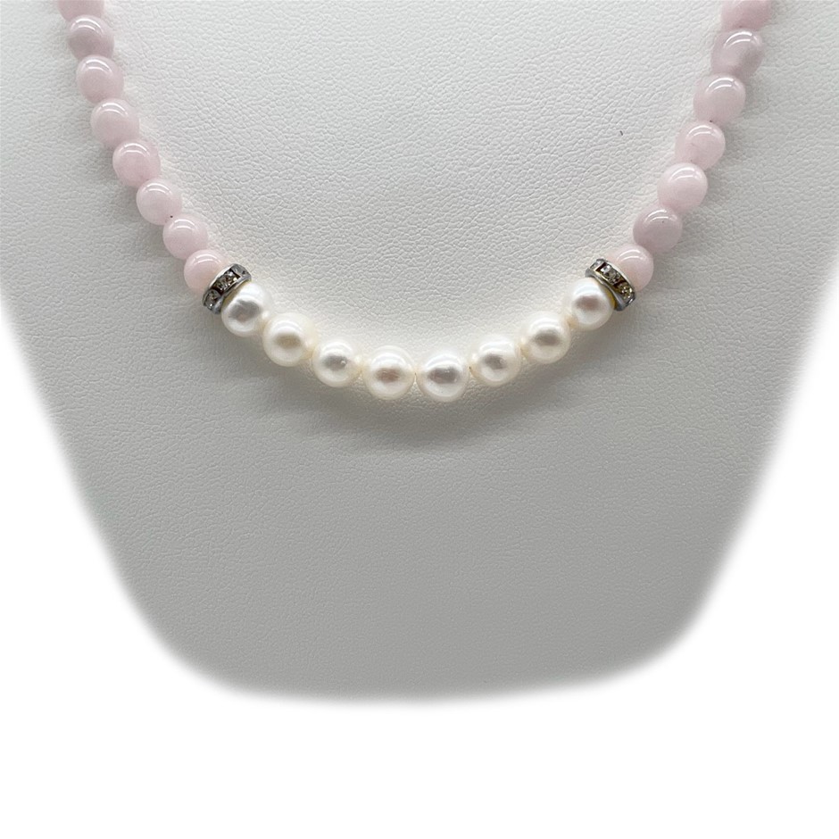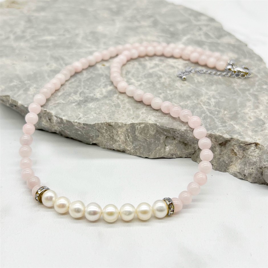 Natural 7-8mm Freshwater Pearl & Rose Quartz with Real Platinum Plated Necklace.