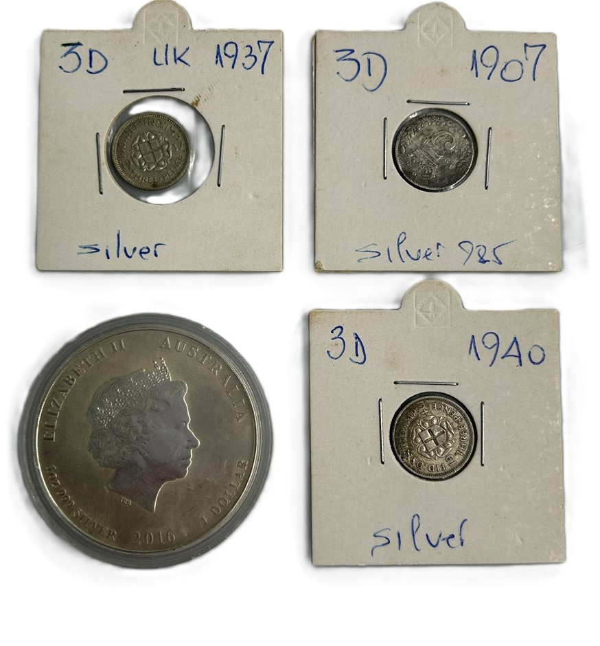 Set of four collectible silver coins including three British Threepence coins - 1907 (.925 silver), 1937, and 1940
