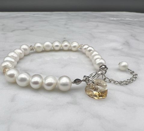 7-8mm Natural Potato & Baroque Freshwater Pearl with Swarovski® Heart Charm Bracelet.