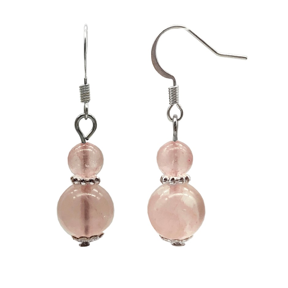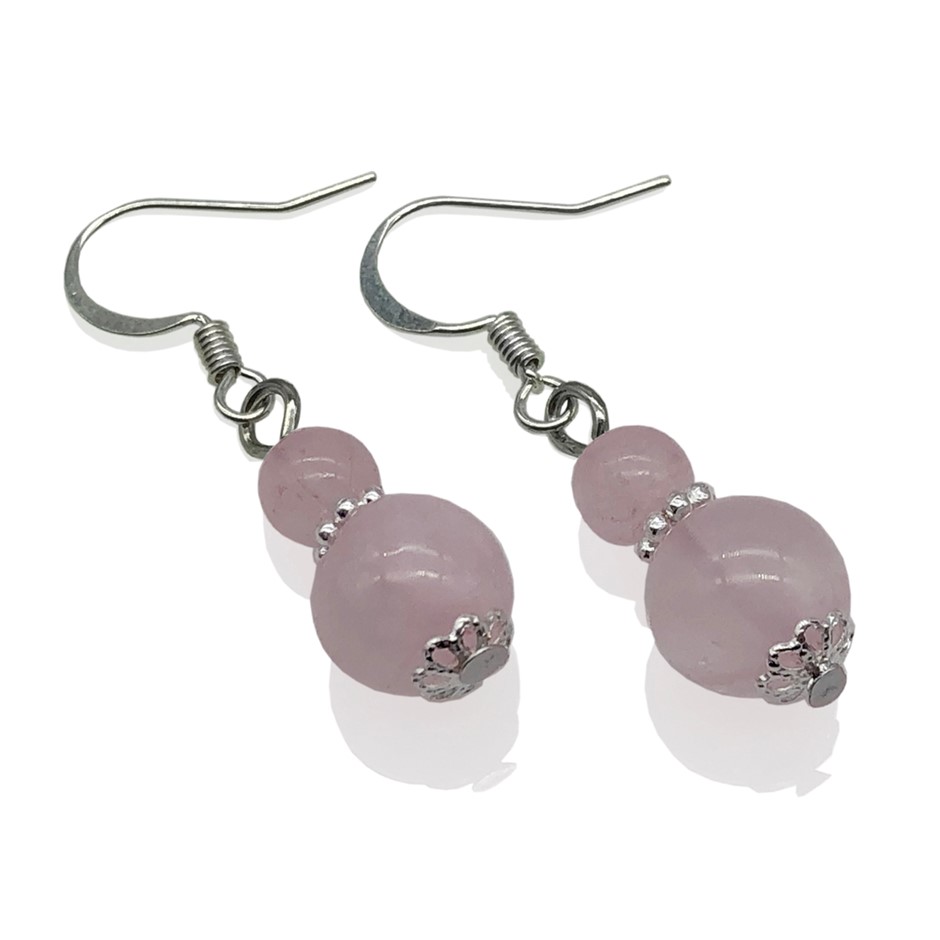 6-10mm Natural Round Rose Quartz Silver Plated Drop Earrings.